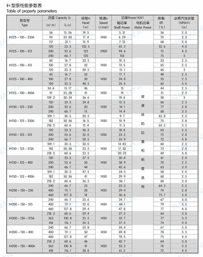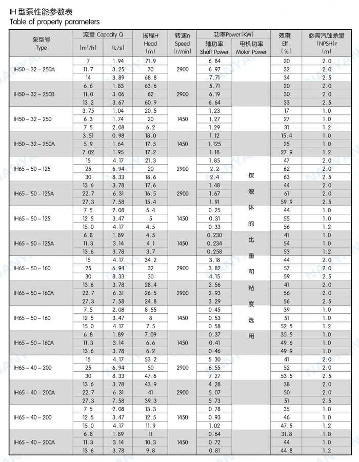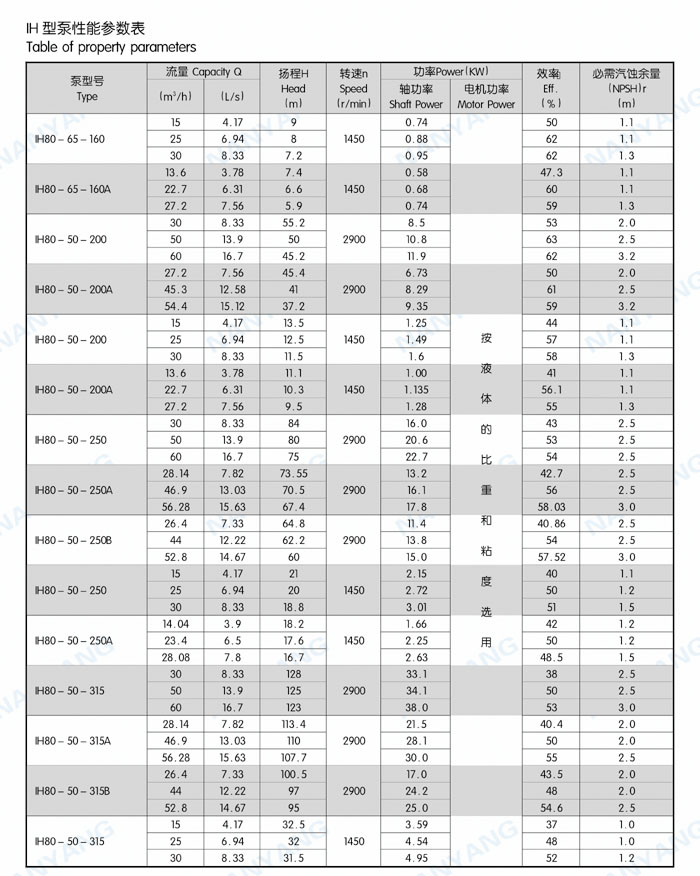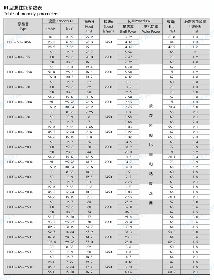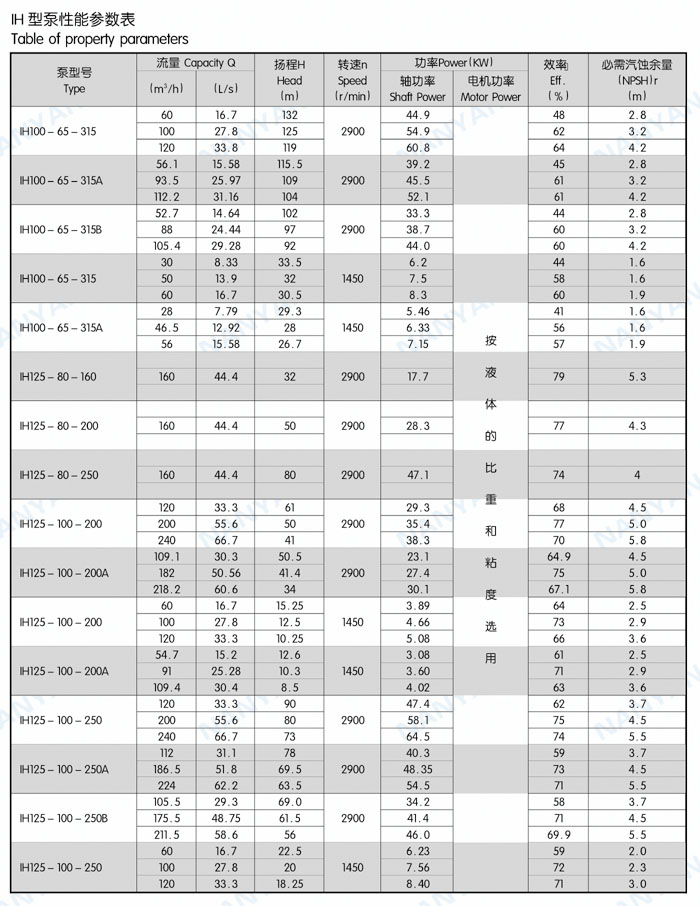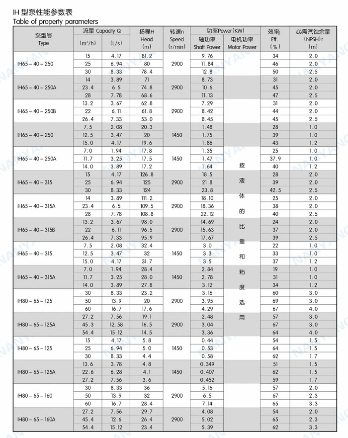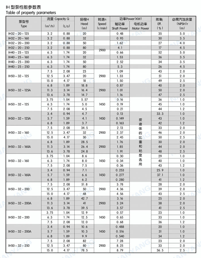 結(jié)構(gòu)特點(diǎn):IH系列泵為腳支撐,可以承受來(lái)自外界載荷直接傳給基礎(chǔ)。軸承潤(rùn)滑方式為稀油潤(rùn)滑,由恒位油杯控制油位,充分保證軸承在良好潤(rùn)滑狀態(tài)下工作,使軸承具有較好的使用壽命。葉輪為閉式葉輪,由背葉片或平衡孔平衡軸向力,殘余軸向力由軸承平衡。軸封根據(jù)使用情況的不同,可采用動(dòng)力密封、單端面機(jī)械密封、雙端面機(jī)械密封、串聯(lián)式機(jī)械密封,可以采用內(nèi)沖洗、自沖洗、外沖洗對(duì)機(jī)械密封進(jìn)行沖洗和冷卻。軸承深溝球軸承、圓柱滾子軸承和角接觸球軸承,分別配有輕軸和重軸,以滿足不同載荷的需要。IH系列40多種泵只需6種軸承架,通用性強(qiáng)標(biāo)準(zhǔn)化程度高,且結(jié)構(gòu)緊湊合理,外觀質(zhì)量好。泵的聯(lián)軸器為爪型、柱銷型、膜片型等供用戶選擇。膜片可分裝式,維修時(shí)無(wú)須拆卸管路和電機(jī),可自由拆卸軸承架、軸、密封箱體、葉輪組件等。泵的入口法蘭水平吸入,出口法蘭垂直向上。從電機(jī)端看,泵軸順時(shí)針旋轉(zhuǎn)。